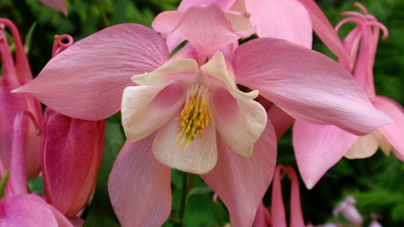 Аквилегия гибридная Спринг Мэджик Роуз энд Айвори очень красива в первой половине лета, когда распускаются цветы удивительно сложной формы. Внешние лепестки имеют розовую окраску, а внутренние – желтовато-белую. Эффектные цветы диаметром около 10 см гармонично смотрятся на фоне сизо-зеленых резных листьев. Растение используется в групповых и смешанных посадках.