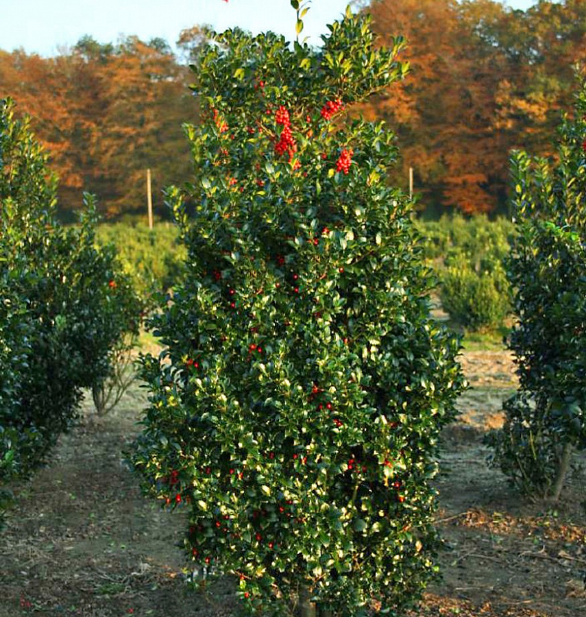 Саженцы Падуба Мезерва Хекенпрахт (Heckenpracht) – интересный и красивый вид падуба. Веточки саженцев расположены вертикально и в будущем вырастут до двух метром в высоту. Кустарник каждый год становится больше на 15-25 сантиметров. Упругие веточки обильно покрыты листвой глубокого зелёного цвета. Каждый листок по краям украшен ярко выраженными зубчиками, они выглядят прочными, но совсем не колются.