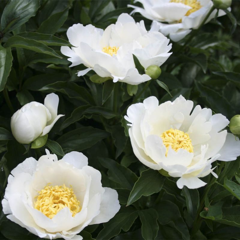 Луковицы пиона для патио Мадрид относятся к травянистым молочноцветковым гибридам, выведенным в США. Растение станет роскошным украшением сада, террасы или даже балкона. Его небольшие размеры (в высоту взрослый куст не превышает 30 сантиметров) позволяют выращивать пион даже в кашпо в комнатных условиях. Мадрид характеризуется заостренными листьями и полумахровыми белоснежными цветами с крупными лепестками, расположенными в два ряда. Центр цветка украшают золотистые тычинки. Достойную компанию пиону могут составить другие виды из сортовой серии пионов для патио.
